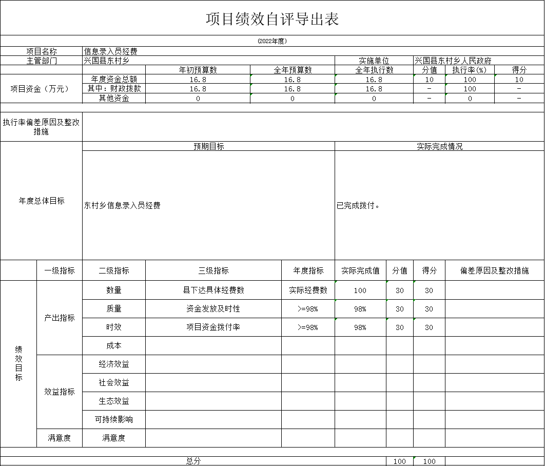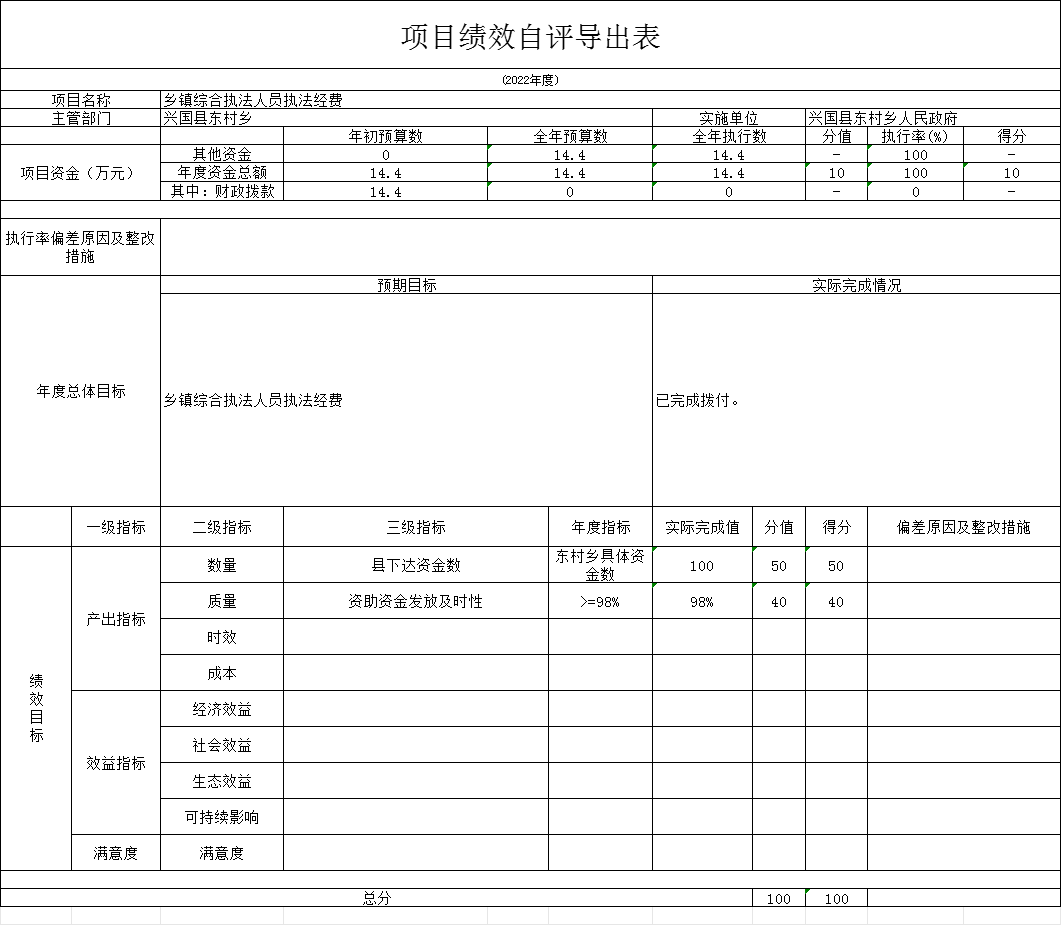 全年執行數完成了年初預算數100%,產出指標、數量指標完成100%得50分;效益指標合格率100%得50分。