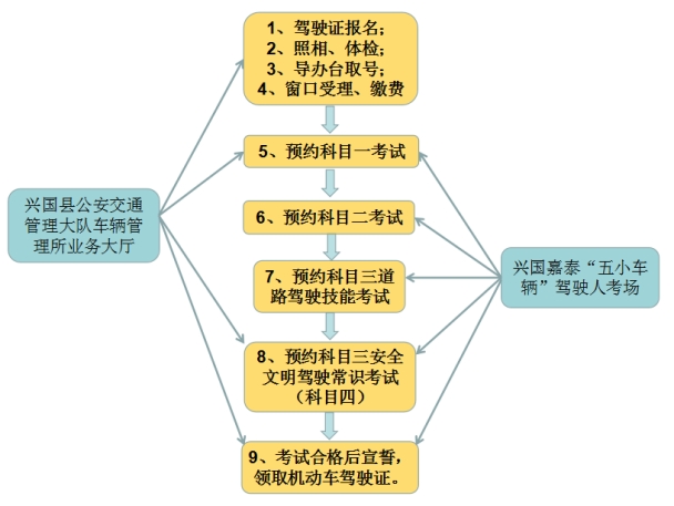 1、到興國縣公安局交通管理大隊(duì)車輛管理所業(yè)務(wù)大廳辦理初領(lǐng)或增駕摩托車駕駛證報名。領(lǐng)取《興國縣公安局交管大隊(duì)駕駛?cè)丝颇恳弧⒍⑷⑺目荚囶A(yù)約憑證》(以下簡稱《考試預(yù)約憑證》)。