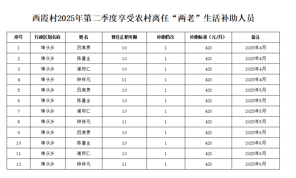【養(yǎng)老服務】西霞村2025年第二季度享受農(nóng)村離任“兩老”生活補助人員名單