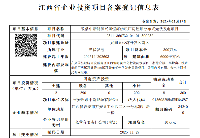 興行審投資字〔2025〕1047號玖鼎中新能源興國恒海紡織廠房屋頂分布式光伏發(fā)電項目備案通知書