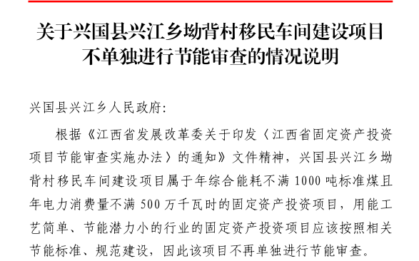 興行審投資字〔2025〕957號關于興國縣興江鄉坳背村移民車間建設項目不單獨進行節能審查的情況說明