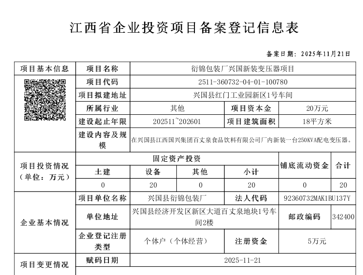 興行審投資字〔2025〕1037號衍錦包裝廠興國新裝變壓器項目備案通知書