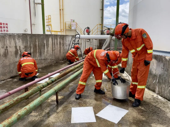 搶險隊員身著防化服沖向泄漏點。途中,隊員緊急協調防爆泵、吸油氈等物資,卻發現現場泄漏柴油濃度遠超預案預設值。領隊通過對講機調整戰術,隊員利用現場工具堵漏。15分鐘后,泄漏點被成功封堵,現場可燃氣體濃度降至安全閾值以下。