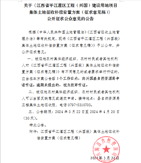 【意見征集】關于《江西省平江灌區工程(興國)建設用地項目集體土地征收補償安置方案(征求意見稿)》公開征求公眾意見的公告