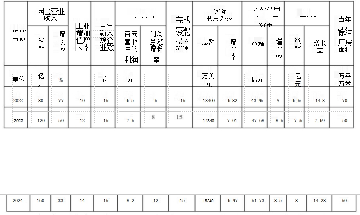 (一)經濟目標:“進位趕超”三年行動期間,到2024年底,園區營業收入突破153億元。每年園區營業收入增幅達33%以上;工業增加值增幅每年實現10%以上;每年實繳稅收增幅達13%以上。