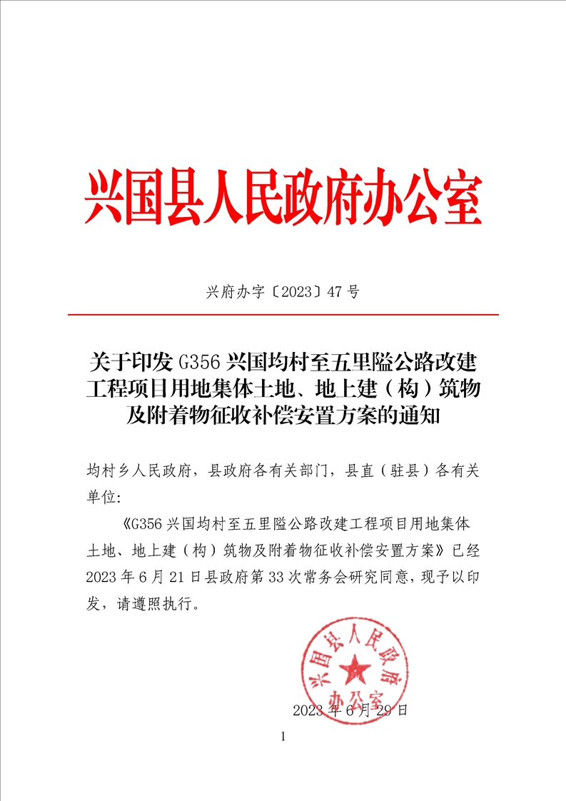 關(guān)于印發(fā)《G356湄西線興國(guó)均村至五里隘公路改建工程集體土地、地上建(構(gòu))筑物及附著物征收補(bǔ)償安置方案》的通知