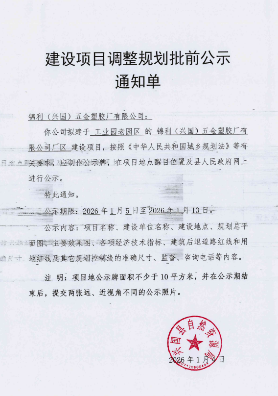 建設(shè)項目調(diào)整規(guī)劃批前公示通知單