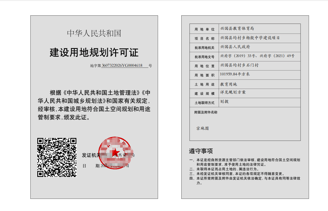(興國縣均村鄉楊殷中學建設項目)建設用地規劃許可批后公布
