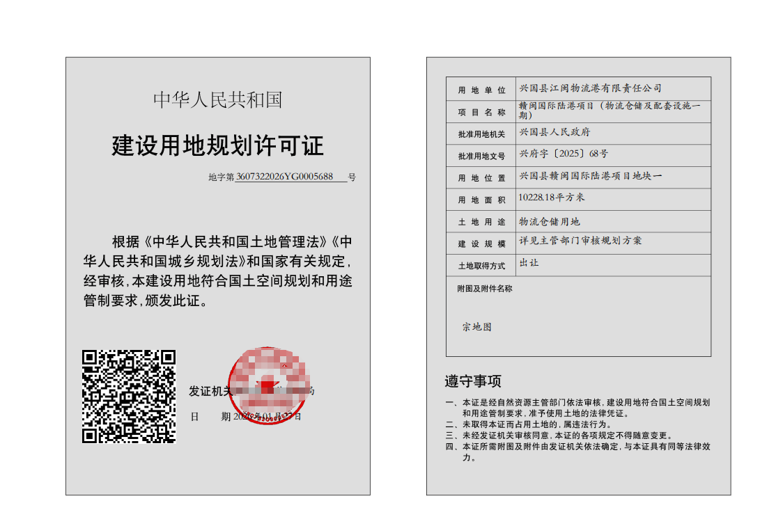 (贛閩國際陸港項目(物流倉儲及配套設施一期))建設用地規劃許可批后公布