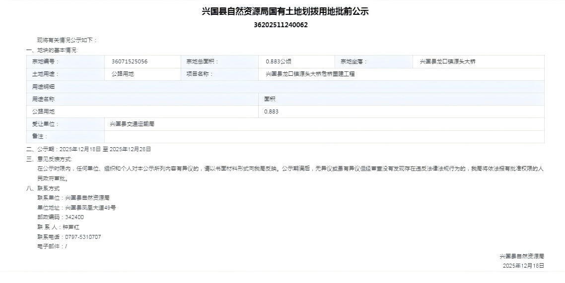興國(guó)縣自然資源局國(guó)有土地劃撥用地批前公示