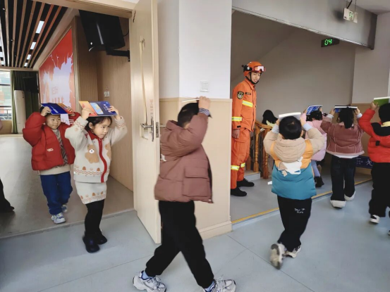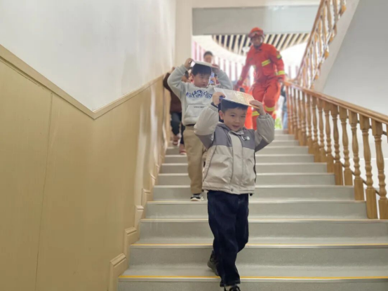 理論科普結束后,全園師生開展了應急疏散實戰演練。隨著演練指令發出,孩子們在消防員和老師的引導下,迅速用書本護住頭部,彎腰低姿、緊張有序地沿著預定路線撤離,快速抵達校園安全區域。整個演練過程規范有序、迅速高效,切實檢驗和提升了師幼應對突發災害事件的快速反應與自救互救能力。