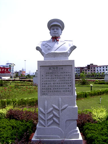 歐陽平(1916-2014.3.24 )原名歐陽俊法,江西省興國縣隆坪鄉人。1930年任村兒童團團長,1931年隨興國獨立師出發攻贛時加入中國共產主義青年團,任村少共支書、區交通委員。1932年參加中國工農紅軍,同年由團轉入中國共產黨。土地革命戰爭時期,任連政治指導員,中央干部團政治委員,紅軍學校黨支部書記,紅軍大學政治教員,炮兵隊指導員,營指導員。參加了長征。抗日戰爭時期,任八路軍總部隨營學校政治處民運股股長、政治教員、營協理員,中國人民抗日軍政大學第一分校政治部民運科科長、干部科科長,八路軍軍政學院政治指導員,赴山東干部隊政委、山東縱隊第四旅政治部主任,魯中軍區第一軍分區政治部主任, 中共泰山地委委員、泰山軍分區政治部主任。解放戰爭時期,任山東軍區第四師政治部主任,渤海軍區政治部副主任,第三野戰軍33軍政治部主任,參加了濟南戰役、淮海戰役、渡江戰役、解放上海戰役。新中國成立后,任淞滬警備區政治部主任、副政委,華東軍區公安部隊副政委兼政治部主任,上海警備區副政委兼政治部主任,南京軍區炮兵政委,人民武裝警察部隊副政委兼政治部主任,成都軍區副政委、顧問,是中國人民政治協商會議第五、六屆委員。1955年被授予少將軍銜,榮獲二級八一勛章、二級獨立自由勛章、一級解放勛章。1988年被授予一級紅星功勛榮譽章。 2014年3月24日,歐陽平同志因病醫治無效,在北京逝世,享年99歲。