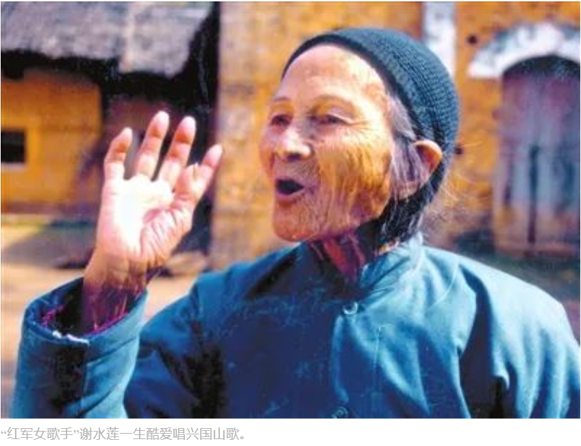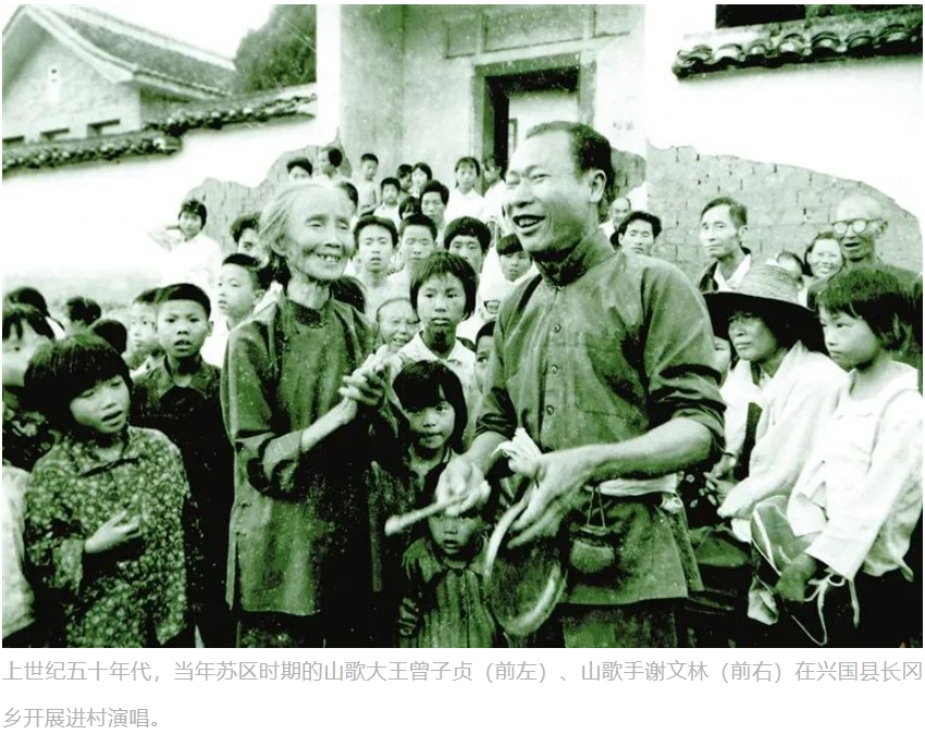 新中國成立后,興國山歌“老樹綻新枝”,以其獨特的魅力鼓舞著人民群眾積極投身經濟社會建設。《黨的女兒》《閃閃的紅星》等優秀影片中,屢次出現“哎呀嘞——”的動人旋律;上世紀七十年代前后,經挖掘整理,一曲興國山歌《蘇區干部好作風》風靡大江南北,成為傳唱不衰的經典名曲和紅色文化符號;興國山歌著名歌手劉承達等人還把山歌唱進了中南海,唱響在人民大會堂。