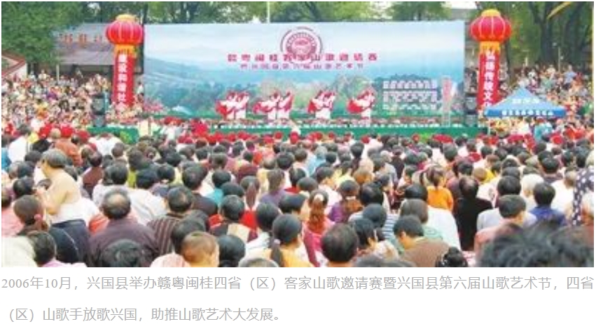 “山歌之鄉歌無休”。興國山歌植根于客家文化的深厚土壤,歌唱內容涵蓋了客家人的所見所聞所感和生產生活的方方面面,飽含著豐富的客家文化信息,堪稱客家藝苑中的一塊綺麗瑰寶,如今還成為宣講黨的創新理論和惠民德政的重要載體和形式,為群眾喜聞樂見。2006年5月20日,經國務院批準,興國山歌被列入第一批國家級非物質文化遺產名錄。2009年,興國山歌藝術節活動被授予全國首屆“群文品牌”,2010年被文化部評為第十五屆“群星獎”項目獎。