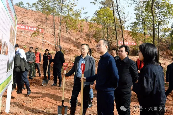 植樹間隙,李賤貴察看了展板,并與有關負責同志交流,詳細了解樹種特性、后期管護及生態(tài)經(jīng)濟價值,叮囑要因地制宜選配苗木,精心做好養(yǎng)護,確保種一棵活一棵、植一片綠一方。他指出,植樹造林功在當代、利在千秋,是生態(tài)文明建設、改善生態(tài)環(huán)境的重要舉措,是實現(xiàn)天藍、地綠、水凈的重要途徑。全縣上下要牢固樹立和踐行綠水青山就是金山銀山理念,強化綠色意識,堅定不移走生態(tài)優(yōu)先、綠色發(fā)展之路,以實際行動植綠護綠愛綠,努力讓興國天更藍、地更綠、水更清。
